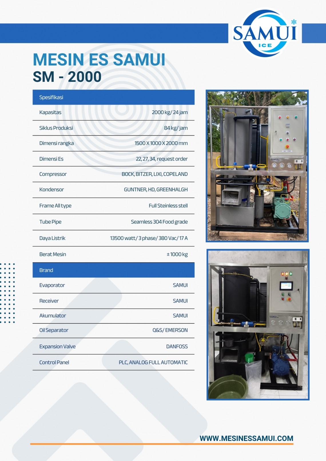 Ditunjang dengan panel kontrol otomatis PLC analog, pengoperasian mesin ini menjadi lebih praktis, efisien, dan minim kesalahan. Mesin Es SAMUI SM-2000 adalah investasi jangka panjang untuk produktivitas tinggi dan kualitas es yang konsisten.